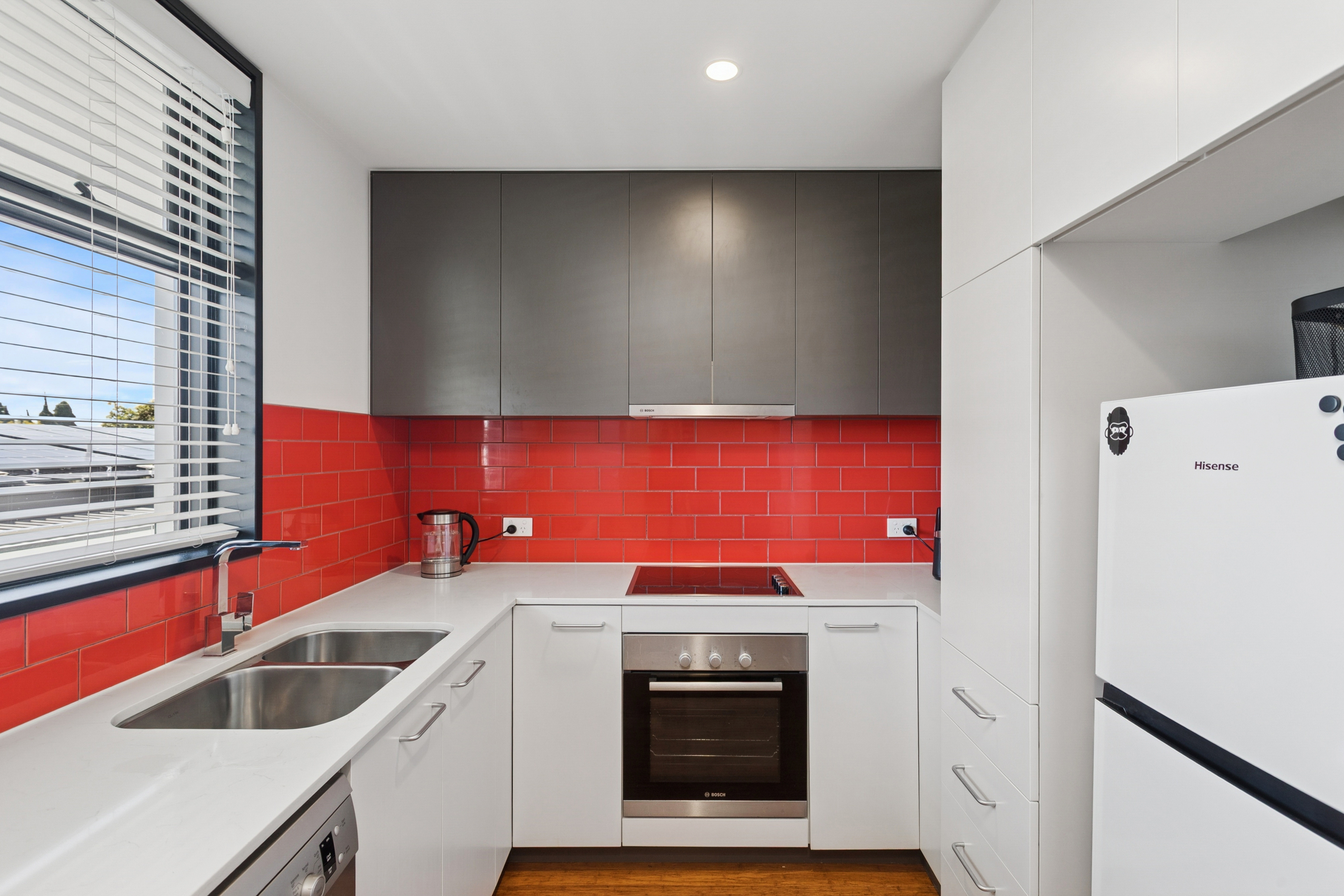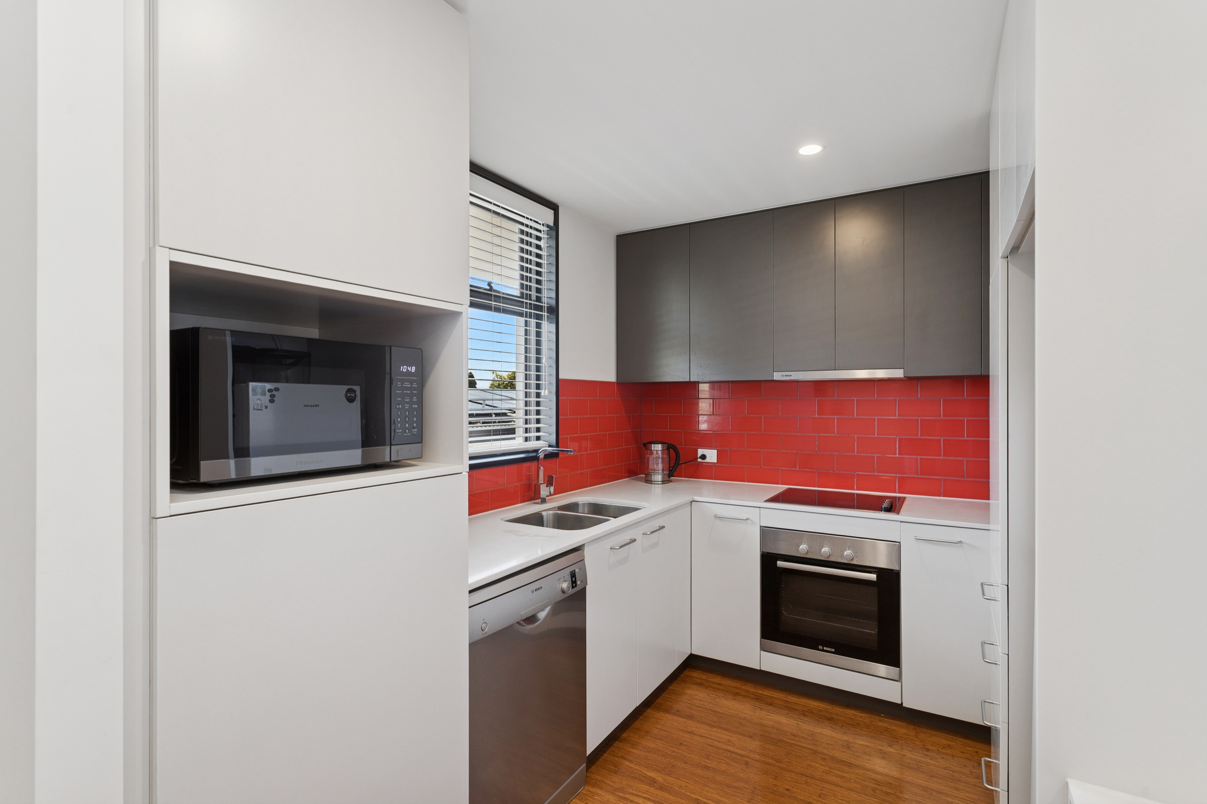 • Sleek, modern kitchen with high-quality appliances, including a dishwasher, and ample storage