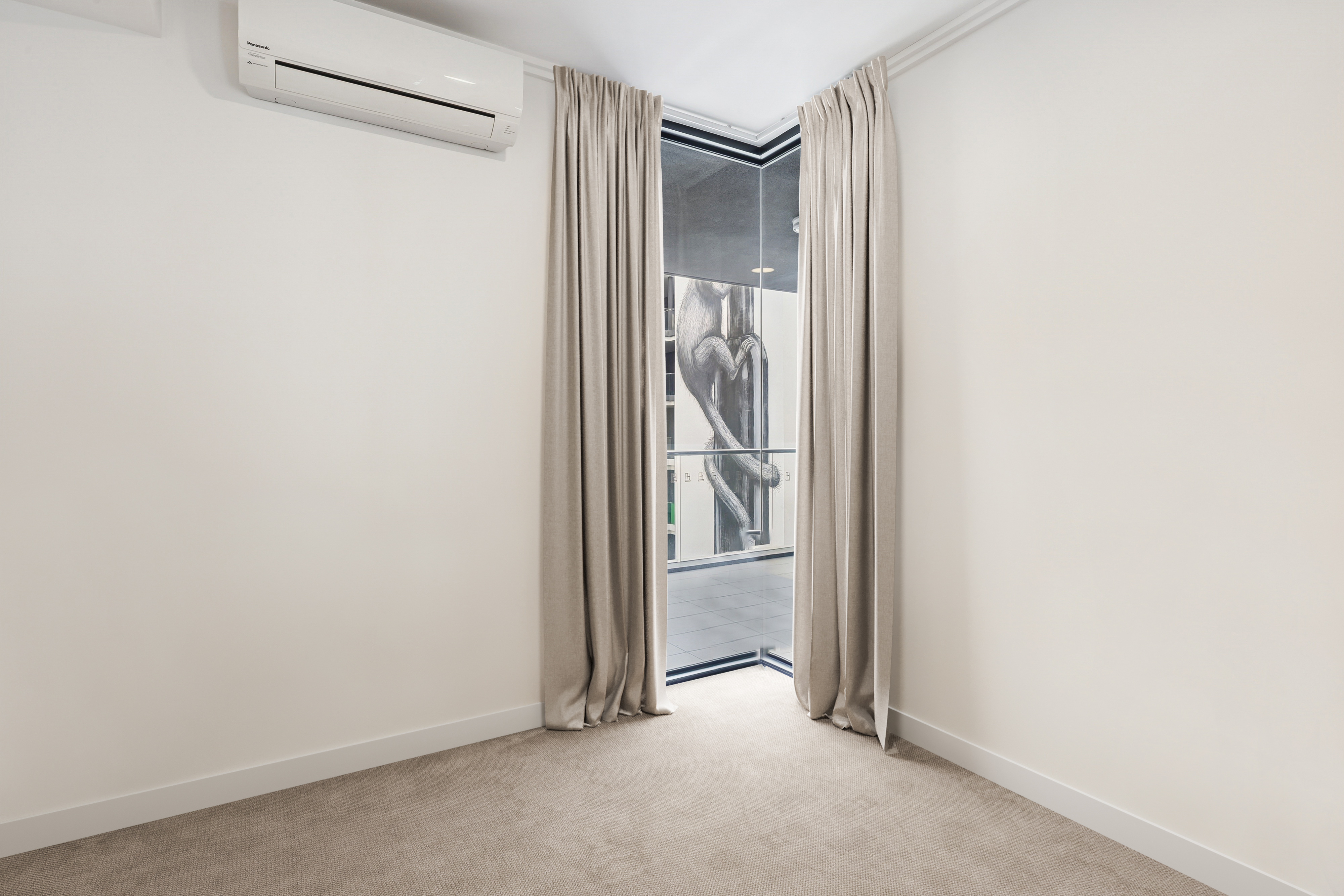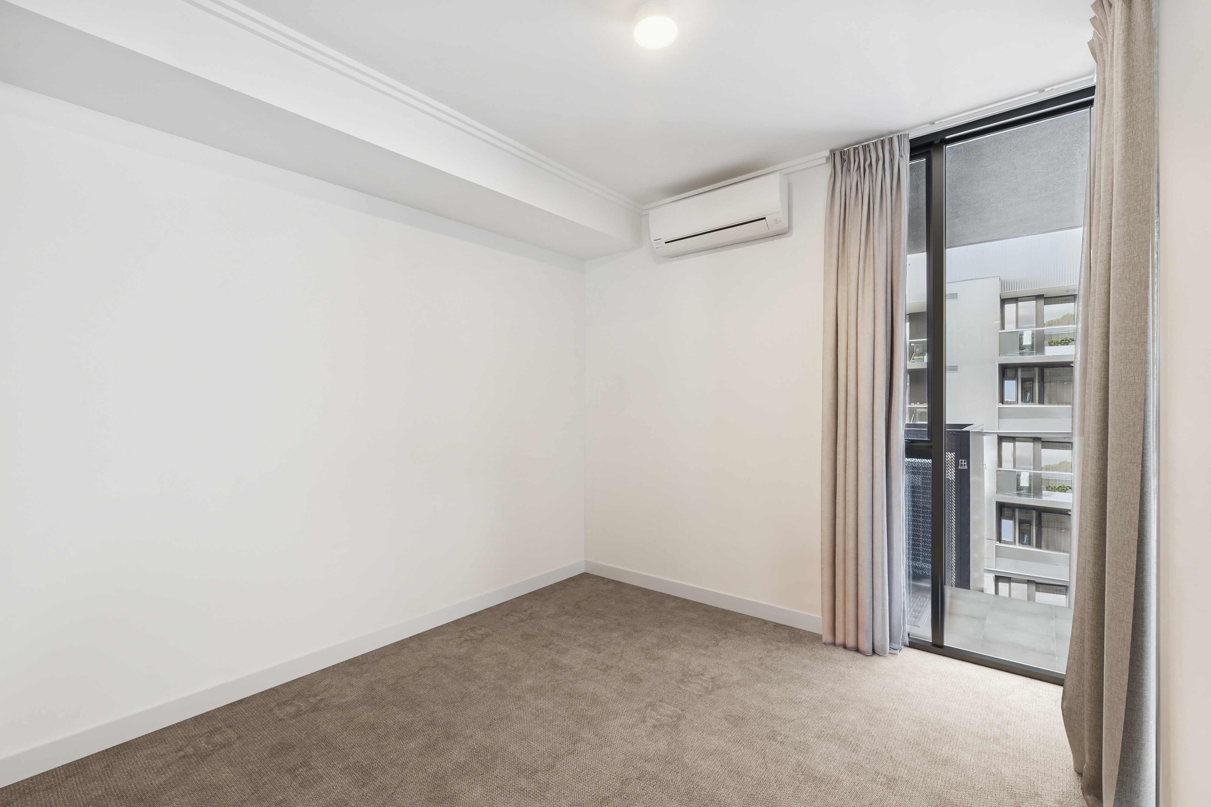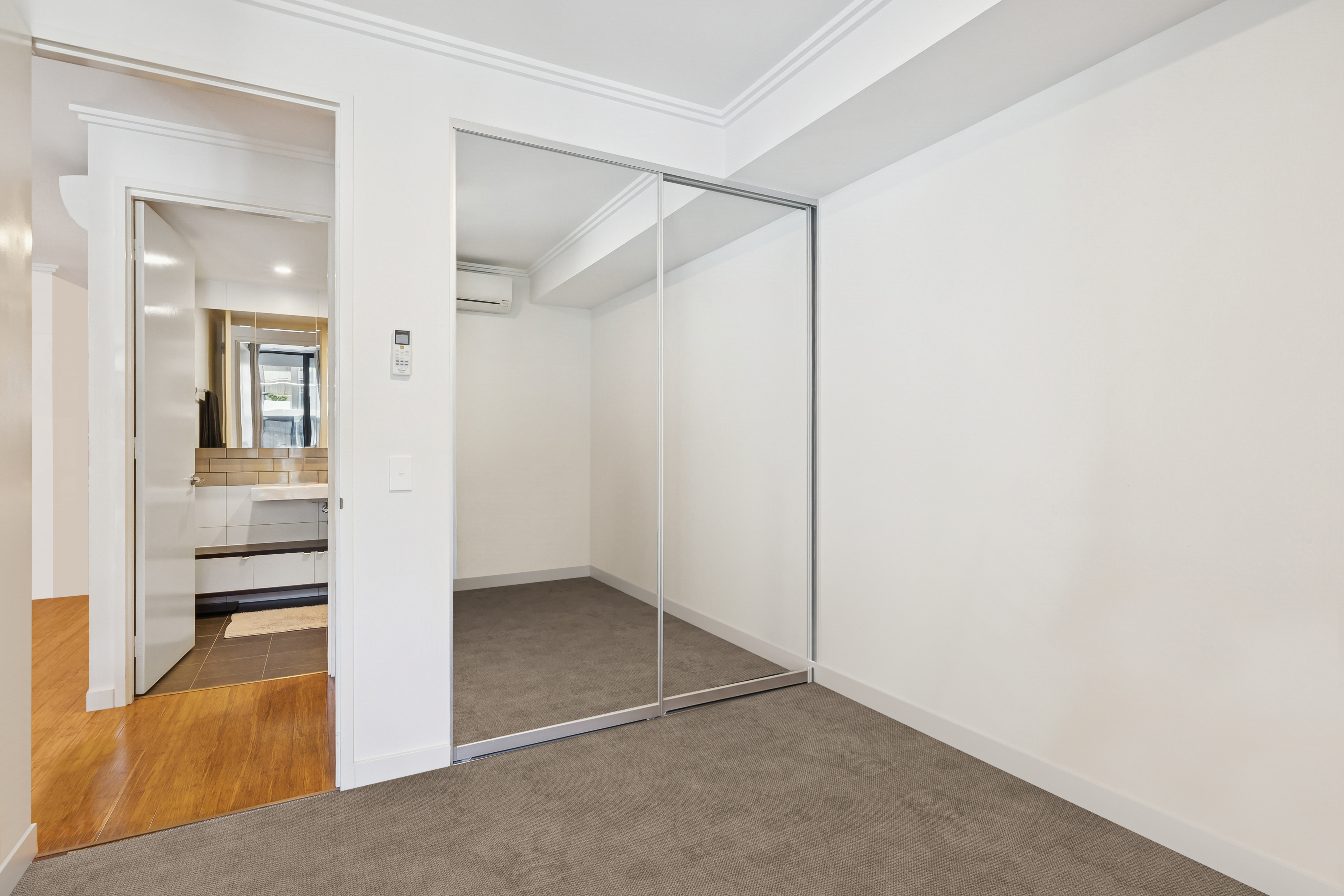 • Spacious bedroom featuring built-in robes, large windows, and a split system air conditioner